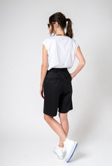 The perfect cotton Bermuda shorts are here. These shorts hit just above the knee for a classic Bermuda short length, with a high-waisted, pleat-front style. They are made of our Cotton Sateen material which is soft and breathable, perfect for those hot summer days.
