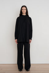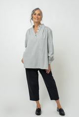 Classic, sumptuous, oversized popover tunic with shirring at the yoke and cuffs and a unique triangle cutaway detail at the side seam.