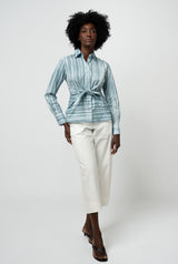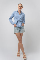 Made to be slim and form-flattering, The Conjunction's tie front top design accentuates a woman’s natural hourglass figure. A spin on the classic dress shirt, the tie at the front creates a cinch without adding bulk. Did we mention it looks great under a blazer?