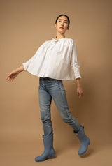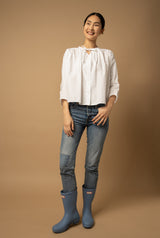 A modern take on a peasant blouse with gathering all up and down the slightly-cropped dolman sleeves. This loose, airy top is perfect for warmer days throughout the spring, summer, and fall. Earrings by hannayoo works.
