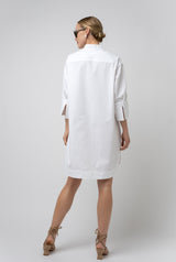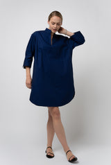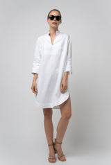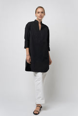 The epitome of simple luxury, this piece can be worn as a tunic or a dress. The oversized silhouette of this tunic dress is endlessly versatile and chic, with three-quarter length sleeves that allow for free movement and comfort. This design features an open mandarin collar with a v-neck that offers maximum breathability on those warm days by the ocean.