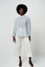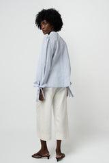 The Poetic Inversion is a reversal of our best-selling Split Infinitive Shirt, featuring its signature overlapping collar---now in the front---and buttons down the back. With gathering at the shoulders and ties on the sides of the wrist, this shirt can be worn backward as well as forward, giving you two looks in one piece.