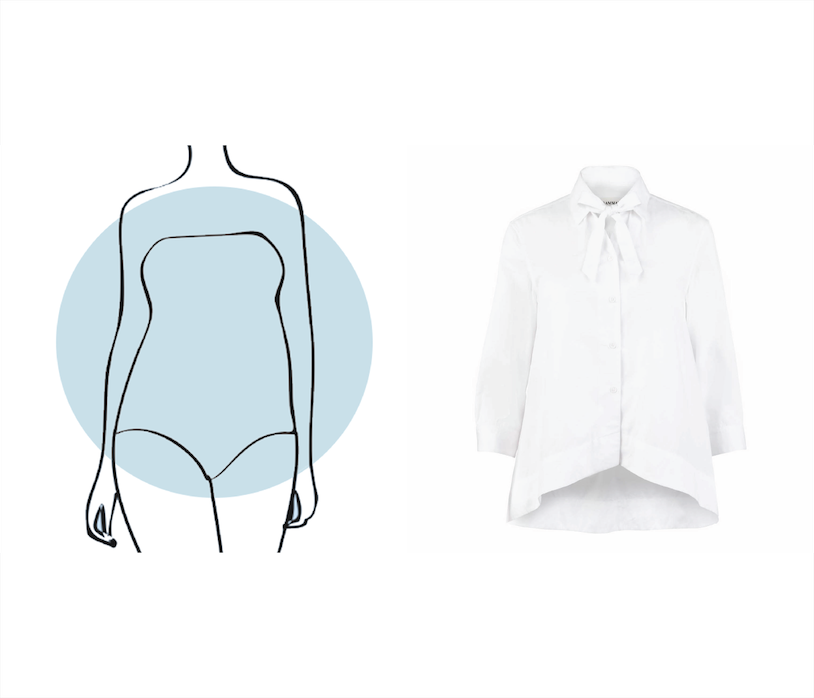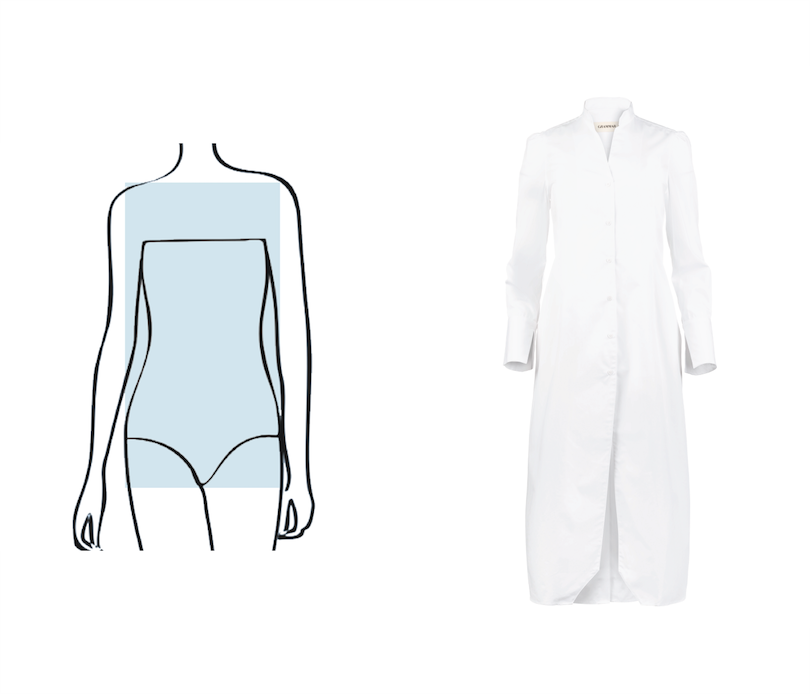 How the Preposition works for you: The collar extension and structured shoulders draw attention to and add width to your shoulder line. A loose silhouette skims over your bust and flares out to obscure your waist all while creating a flattering diagonal line at the front and back hem across your hips and booty.