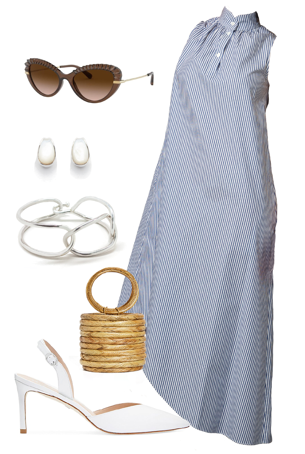 On Point: Need a glam, versatile look for summertime events? The Simile Dress in stripes paired with white, slingback pumps, is a go-to, timeless look for indoor and outdoor events. Create this lovely and comfortable look by selecting a neutral-toned pair of cat eye sunglasses, pearl earrings, a silver cuff, and a mini basket handbag.